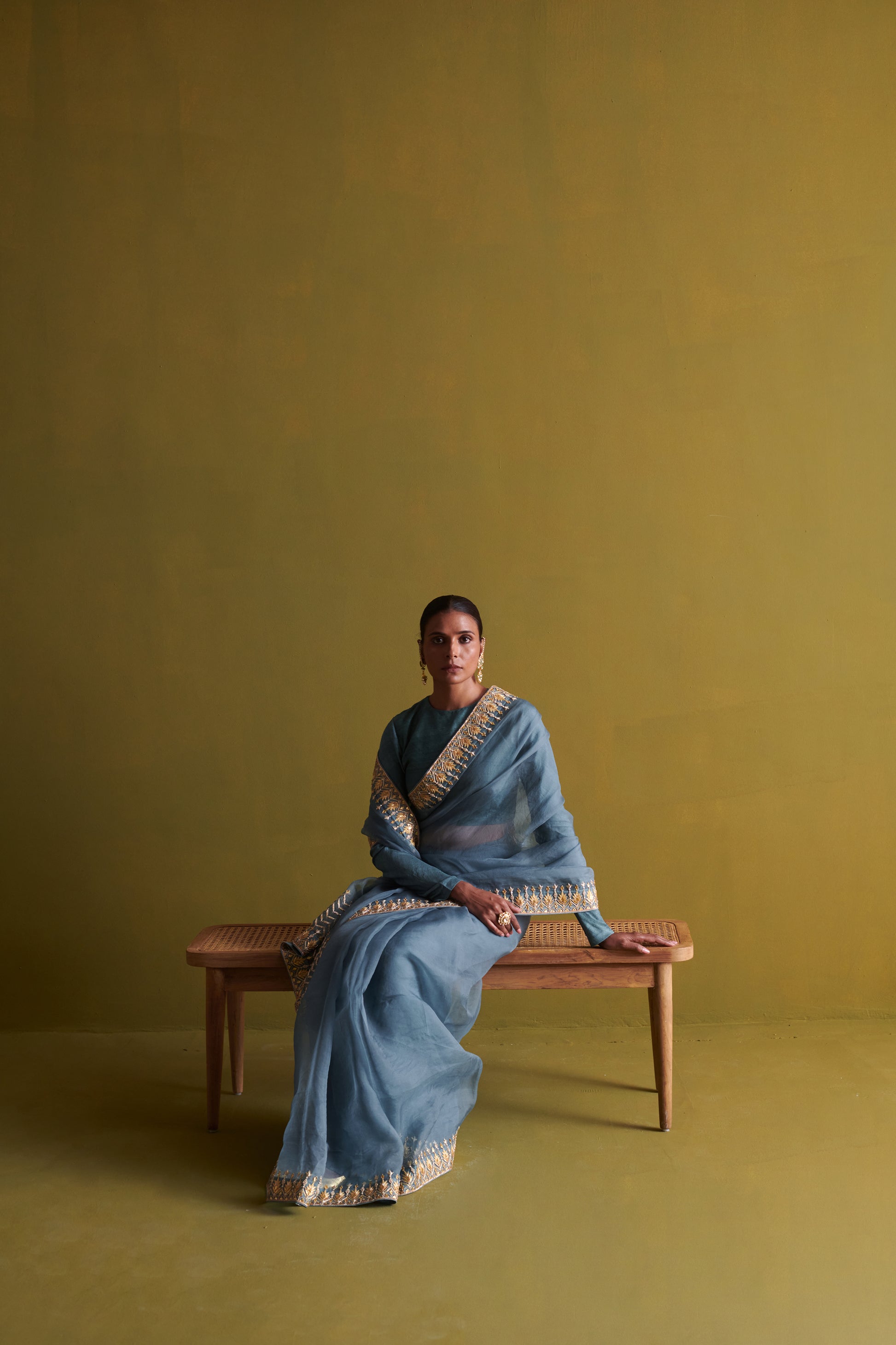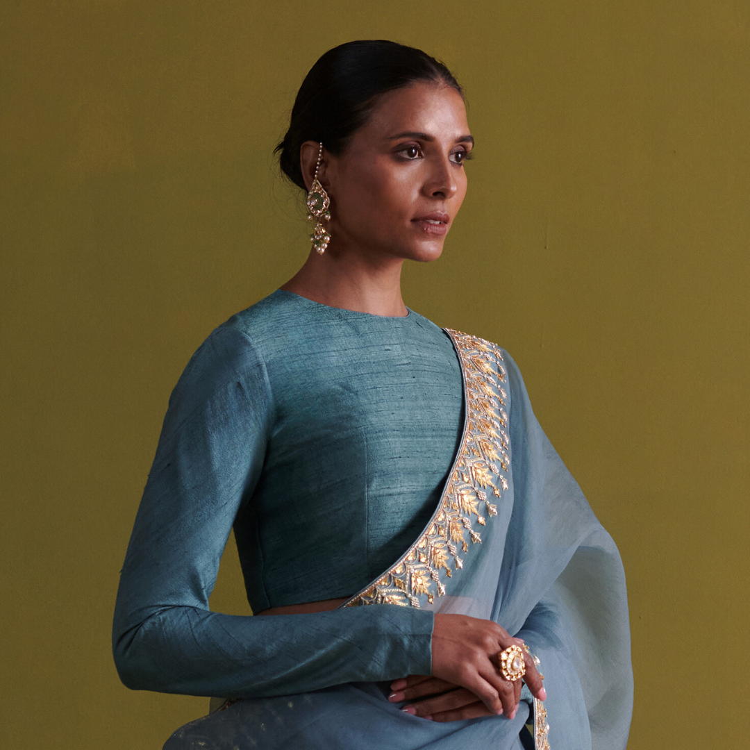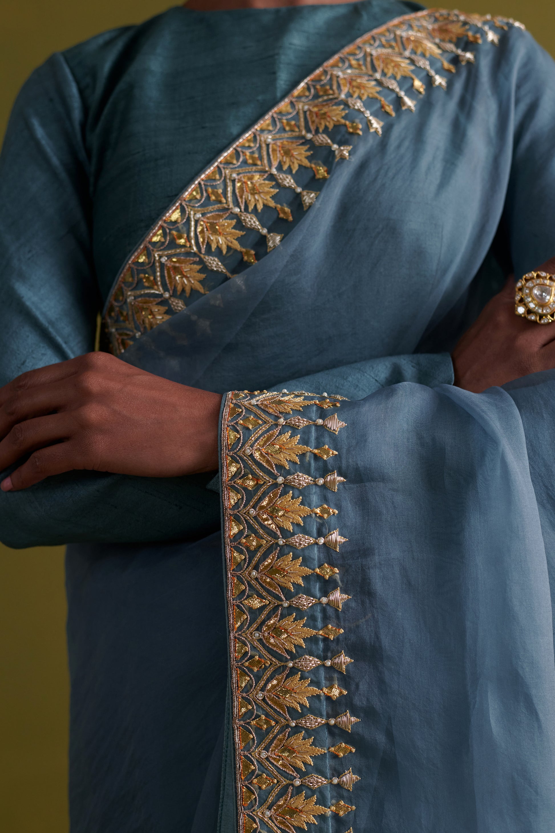 Featuring a ombré red rani Saree in Silk organza base with dainty embellishment of Rose Buds with hand Embroidered Gota Patti Jaal & Border. It is paired with matching mashru silk blouse with Petticoat.