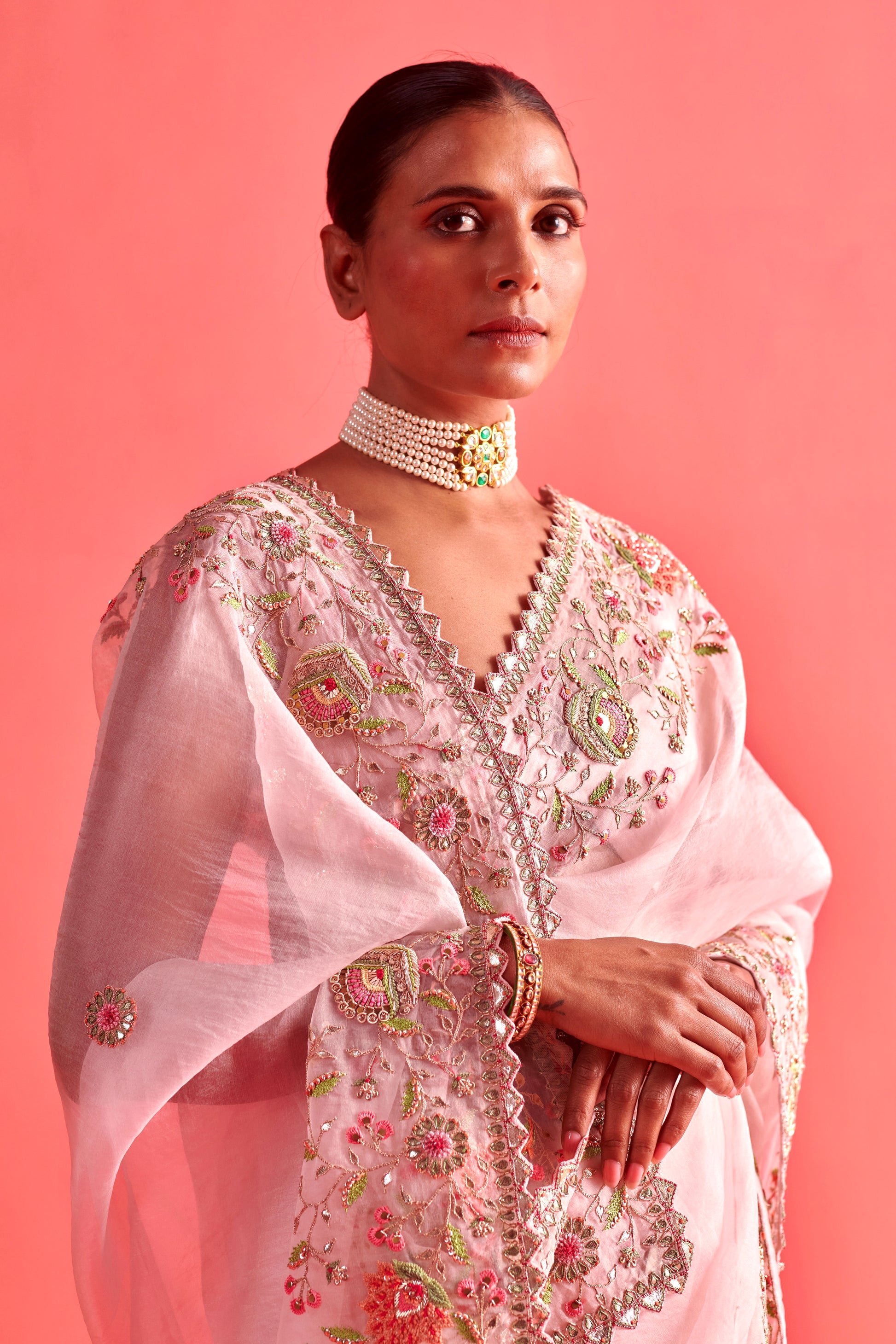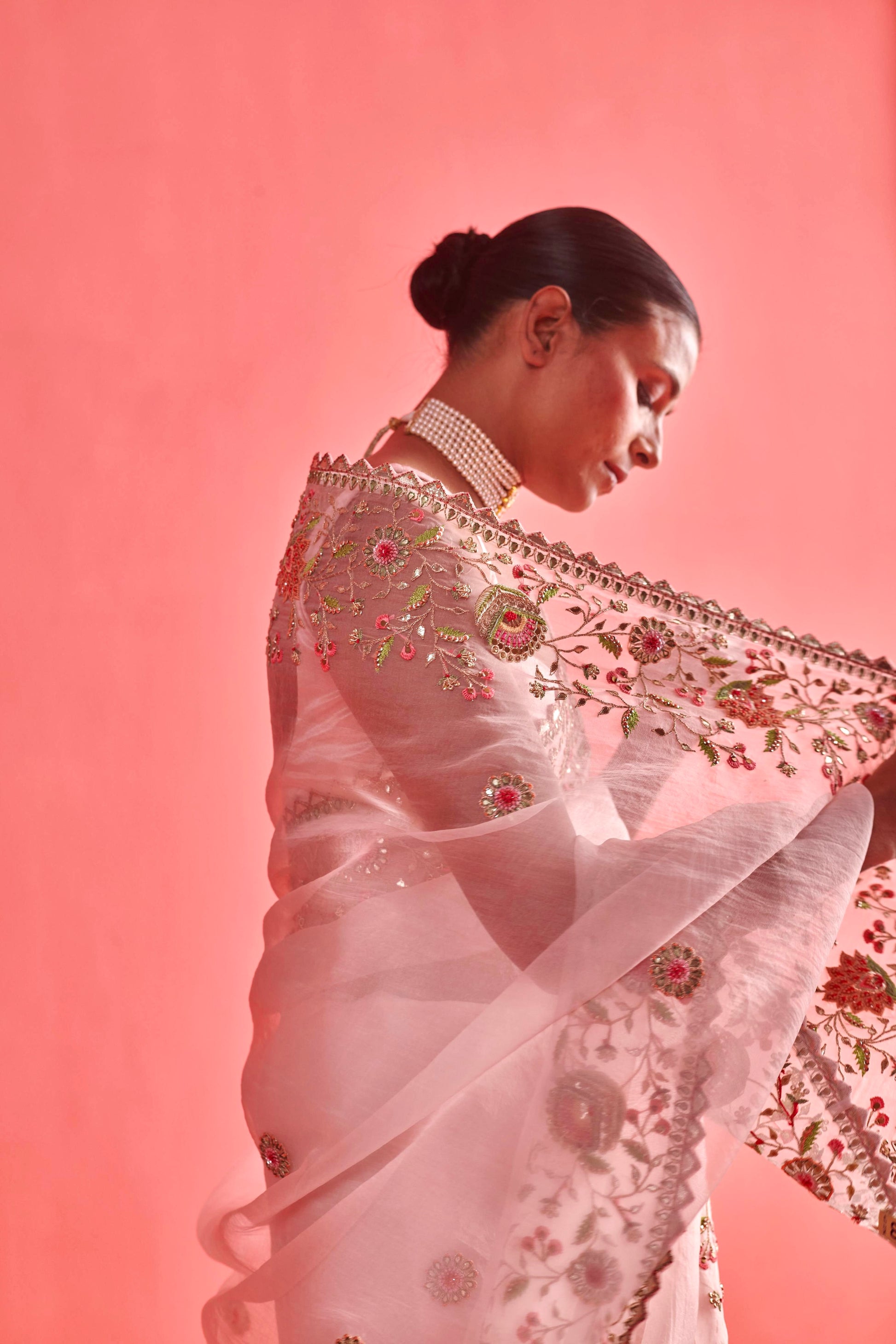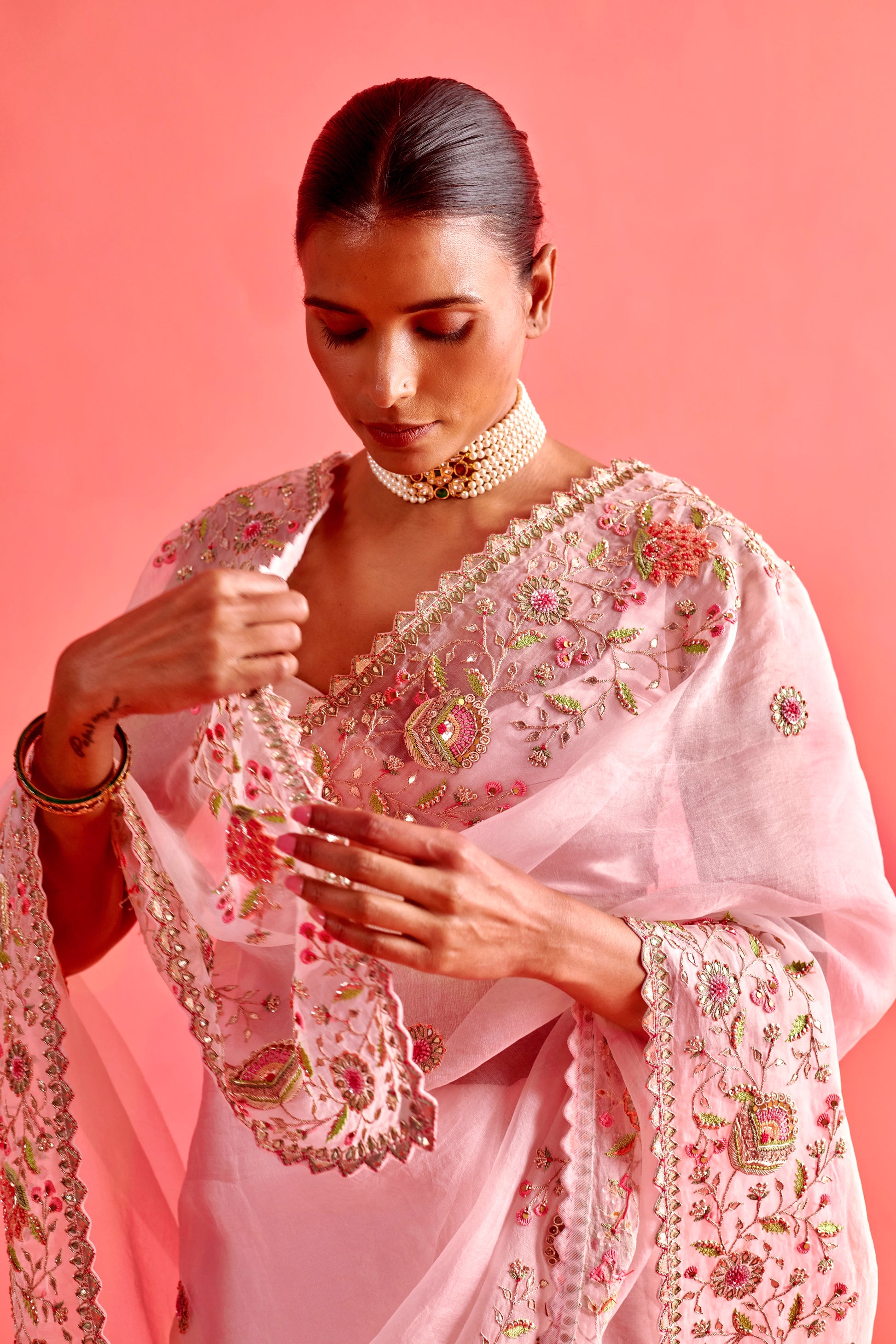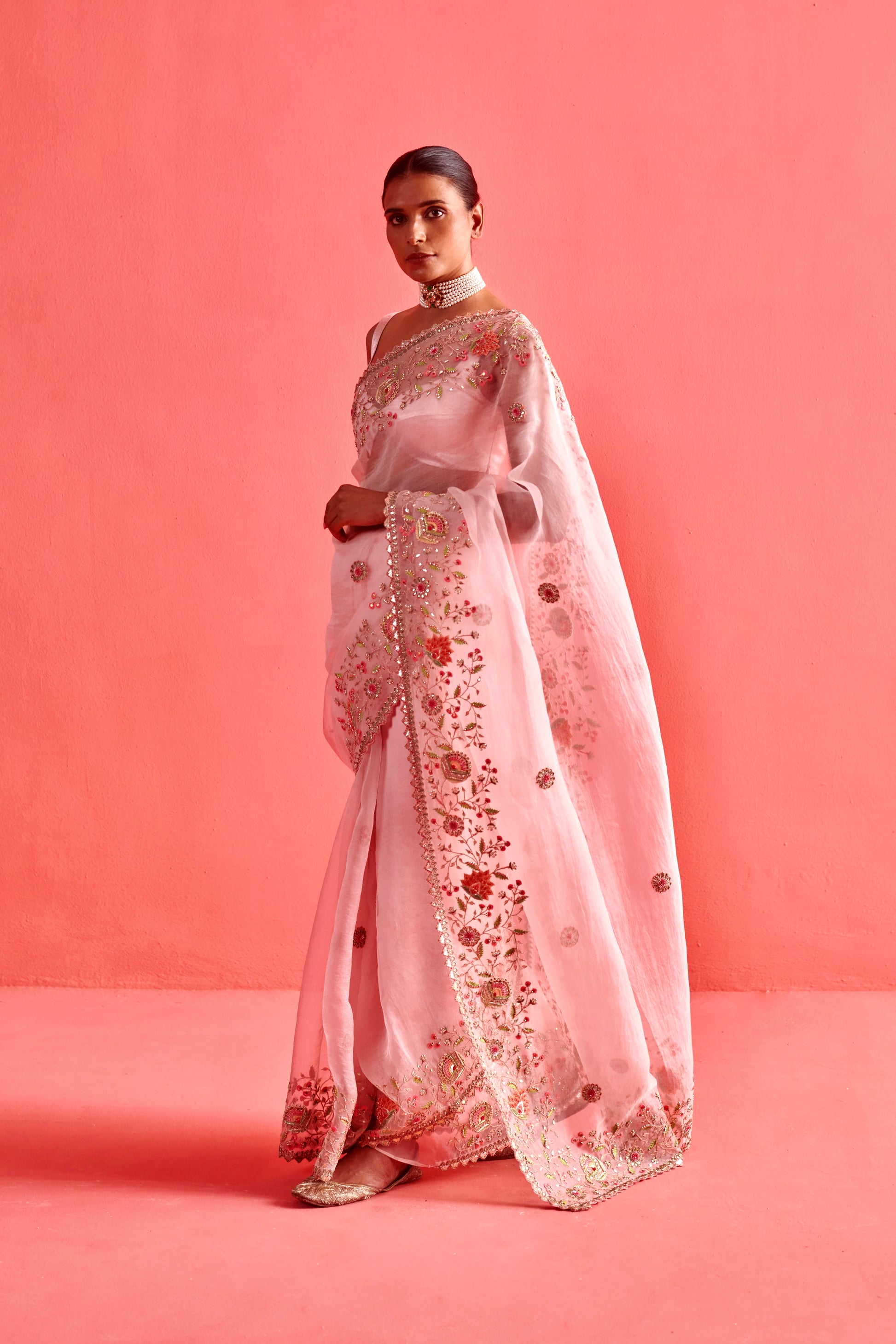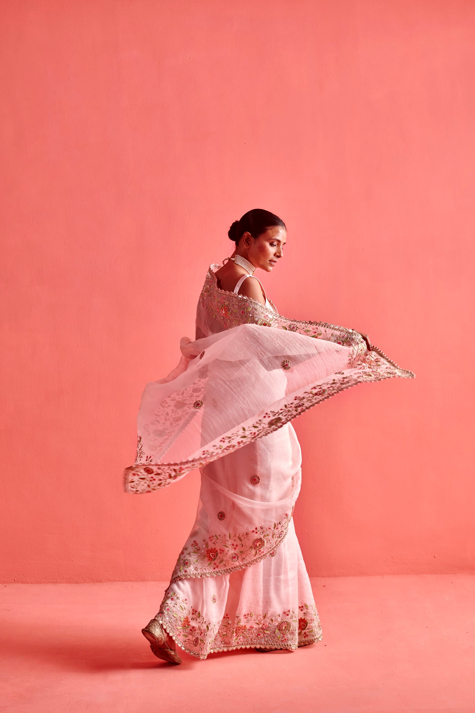 featuring Powder pink saree in silk organza base adorned with dainty brass coins, Mukesh thread work perfectly paired with exquisite sleeves mashru silk blouse .