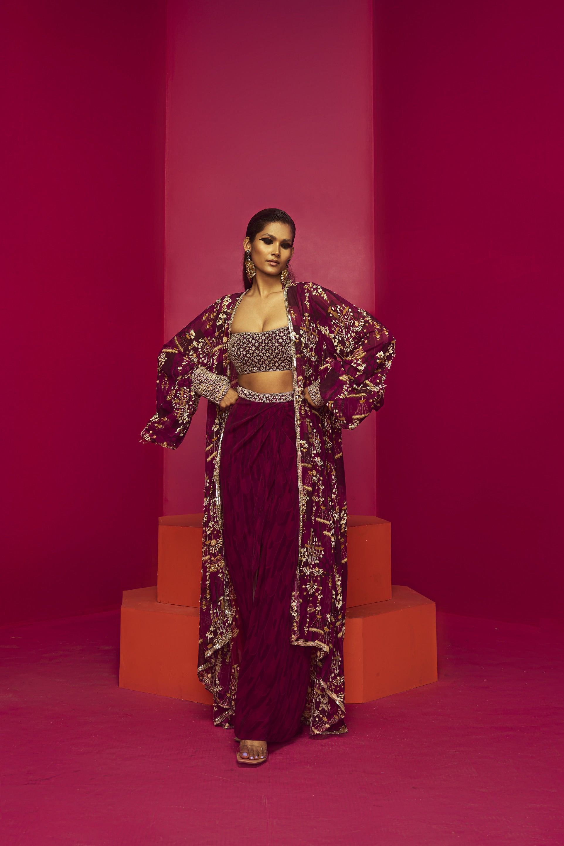 Embellised blouse paired with dhoti skirt & cape